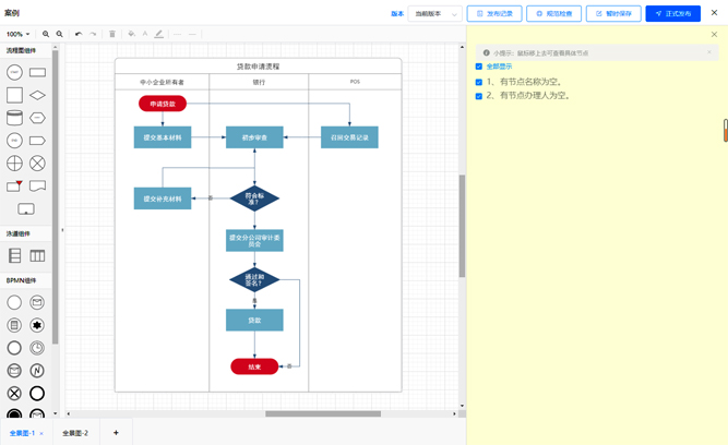 流程建模及编制模块新增了流程图绘制规范检查功能。在绘制流程图时,根据流程图规范进行自动检查,包括连线检查、空值检查、循环检查等,当发布时不符合规范流程图进行提醒提示。让流程图真正实现一键发布。同时针对流程版本还完善了以下三大功能: